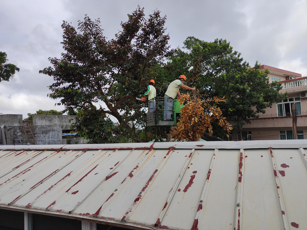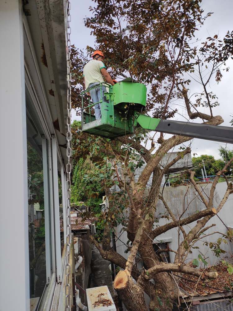 The tree next to our house, the braches thereof have fallen on our roof several times when winds of typhoons blow stromng, have finnaly been trimmed by the city hall. Every movement of the workers was followed with interest and thankfulness.