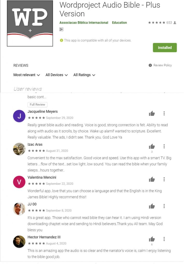 “Really great bible audio and reading. Voice is good, strong connection is felt. Ability to read along with audio as it scrolls, by choice. Wake up alam if wanted to scripture. Excellent. Really valuable. The ads, I didn’t see. Thank you. God Love Ya // Thank you all for this gift from God. There are people who prefer to listen to it than read it. Only there are audios that his voice is heard far away and in others a strange background is heard. Keep improving the audios. Greetings to all and keep doing good in the name of Jesus. Jehovah’s blessings // A blessing to have The Word in audio with all the improvements made. I especially like the continuity of reading without stopping between chapters. I appreciate your work and I ask God to bless you greatly. // How good it is to use the internet to always have the Word of God rooted. // Beautiful is this Bible that the Lord Jesus Christ bless and protect the brothers who gave this blessing give the desire of his heart to all who gave this blessing // I love the audio. I am able to listen to the scripture when I can’t read it for myself. // It’s a great app. Those who cannot read bible they can hear it. I am using Hindi version downloading chapter wise and sending to Hindi believers. Thank you All team. May God bless you // It is the most effective, I appreciate the effort of its makers, this application has a very special anointing, the best praise for its creators. Blessings !!! I recommend it for sure, I did not find a better one.” (all words copied from users reactions and comments at Android App interface)
