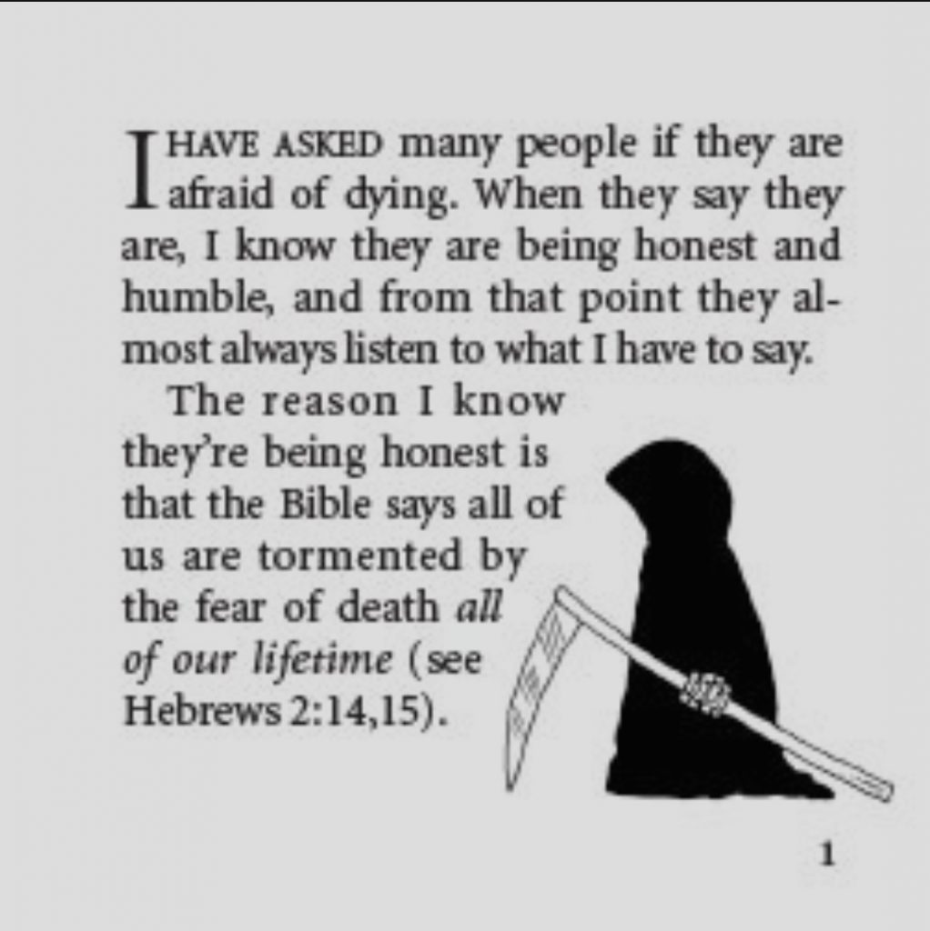 This month we introduced a new page to our resources containing the “fear of death” tract. For those who are afraid of dying, all of us, to be honest, this tract deals with how to face that fear and the prospects for our lives after death. Interesting reading for people of all ages in this very troubled and death-prone world. Go read it here: