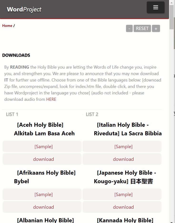 Maybe you already know that our website has many hidden or less obvious features. For example, you may download a language Bible and have it in your computer, without the need to go online. This is useful for many people who wish to create a Bible site of their own, in their own language, or even in multiple languages – a cloned version of our site. This is actually great for us because it represents an exponential multiplication of our efforts to broadcast the Word of God to the whole wide world. Here is the link to the page where you may download just about any language or version present at Wordproject website:
