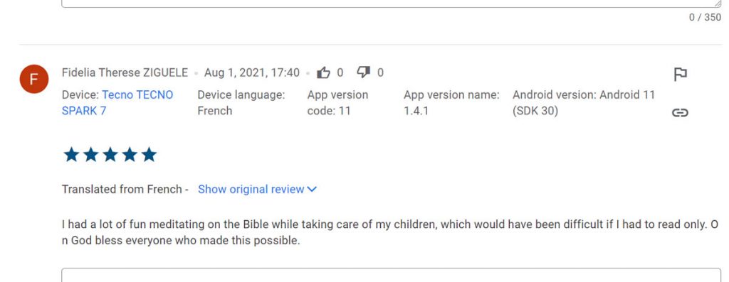 Comments like this, found on the page of WP app, remind us of the variety of uses and the impact of our online ministry. We are encouraged to improve and respond to the increasing demand for the Word, all around the world. These are peculiar times, and as trust in humans is waning everywhere, the quest for transcendent answers and spiritual strength is ever more urgent– some of our users wrote: