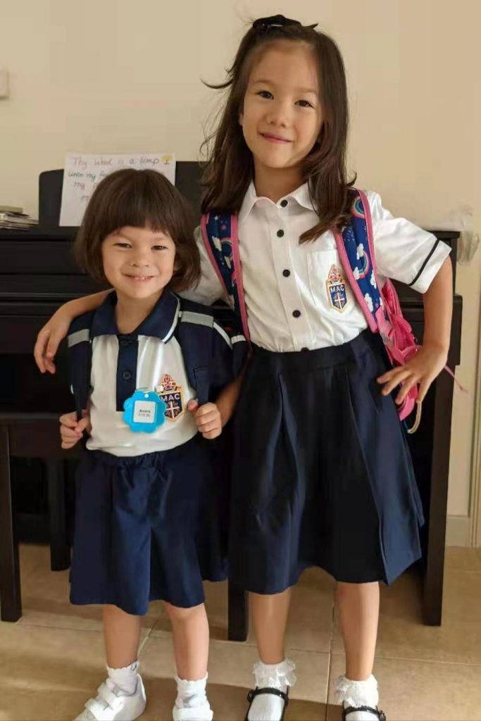 Sweet Isabel and Aurora are back to school! For Aurora, 3, this is her first year in K1, and she is one excited student, looking forward to all the friends and activities this new experience will bring her way! Veteran scholar Isabel is now on Primary 1 and loves learning! We wish them both a wonderful school experience this year!